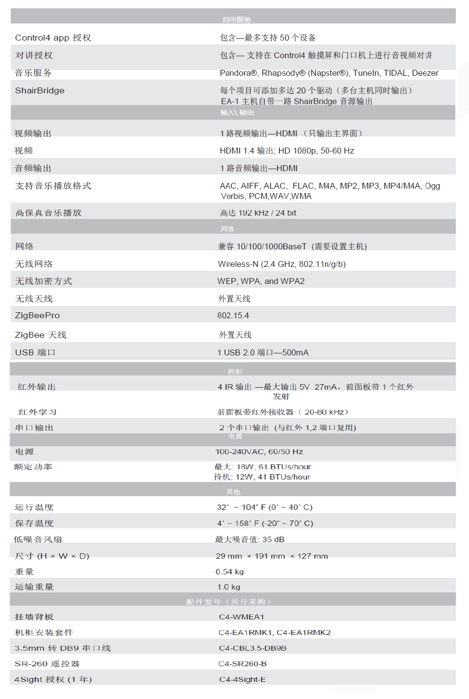 為了娛樂,EA-1還包括一個內置的音樂服務器,允許您收聽自己的音樂庫、來自各種領先的音樂服務的流,或者來自使用Control4 ShairBridge技術的支持airplay的設備。