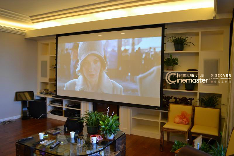 業主花了2000多大洋請人從地面把130寸電動幕吊上去