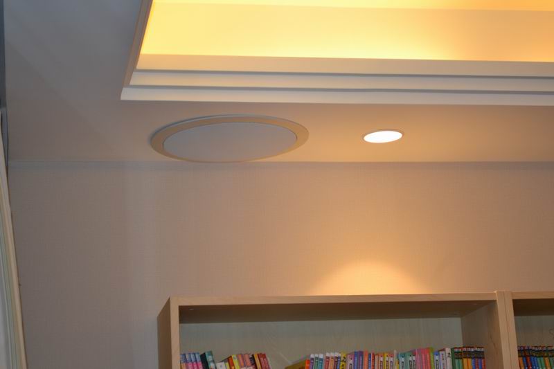 杰士5800C的吸頂喇叭,高音單元可以轉動方向,13CM的厚度嵌入到燈槽不占多余空間,配上白色網罩毫無違和感。