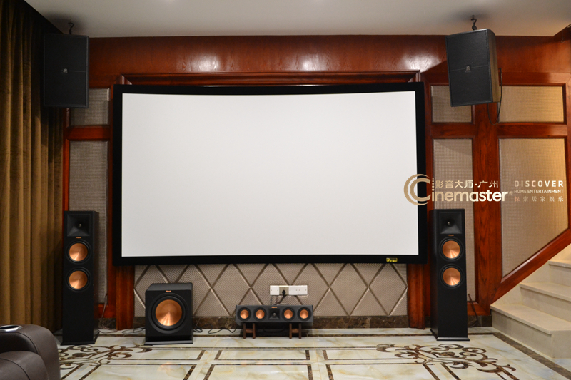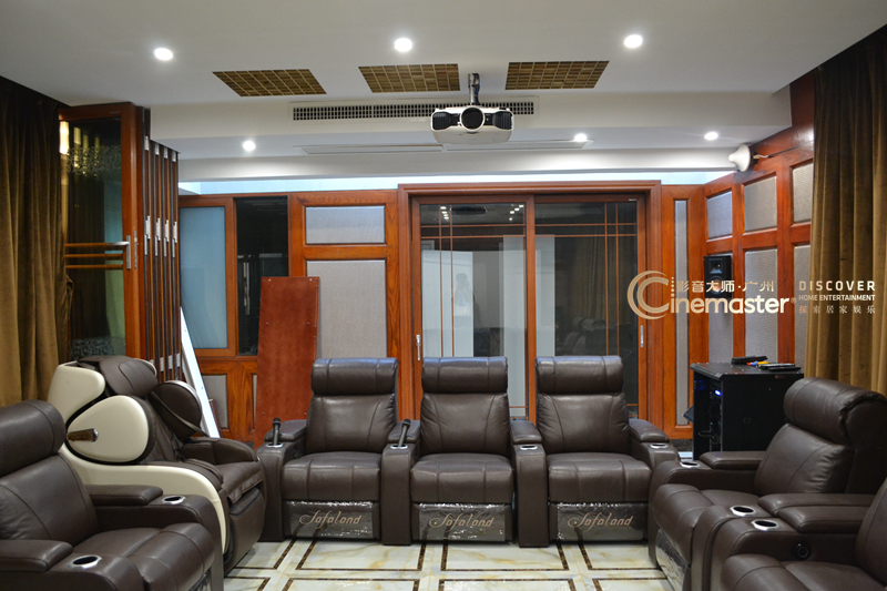 本次案列的場地比較特殊,雖然是在地下室,但是影音房不是全封閉式,投影面右邊剛好是上樓梯的地方,而且樓梯部分還有采光的地方,白天會有光線照射到影音房。另外投影面左邊是后花園,用戶當時設計的時候也是要采光的。那眾所周知,影音房觀影最好是全黑的環境才能發揮出好的效果,因此我們能做的就是想辦法遮光。如果說把這些采光的地方都封起來,那也是比較麻煩的工程,所以最終我們建議用戶選擇了灰色系窗簾,且是加厚型的。這樣在觀影的時候我們可以把窗簾關上,既可以營造好的觀影環境,加厚型窗簾也可以合理的對房間做一些吸音,也就是說還能彌補非密閉式空間的聲學問題。其實在聲學方面我們除了墻面做了強吸音以外,頂部也裝了擴散,由于底板用了大理石,沒有任何吸音效果,那配合聲學處理沙發也都推薦采用了加厚型的軟沙發,也可以做一些聲音吸收處理,整個環境還是已經打造成一個非常理想的聽音環境,所以最終的效果用戶也十分滿意。