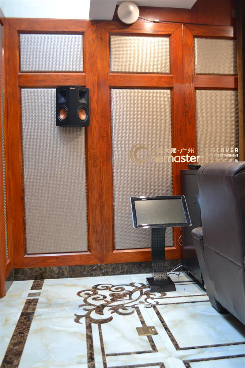 環繞音箱采用杰士RP-250S壁掛,點歌機觸屏放置在沙發旁邊。地板的花紋很漂亮,哈哈~