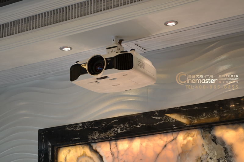客廳后方,愛普生TW8200 3D投影機吊頂安裝,愛普生此款投影機特有的前排風(fēng)前進風(fēng)技術(shù),使得投影機不需要再像傳統(tǒng)的投影機,從側(cè)面進風(fēng)側(cè)面排風(fēng),需要留足夠的空間給投影機散熱,于是我們就可以把投影機貼到后墻安裝,而不占用天花的位置。另外此款投影機有2.1倍光學(xué)大變焦,也讓我們對安裝距離選擇非常靈活。此外,投影機還具有強大的電動位移功能,鏡頭記憶功能。