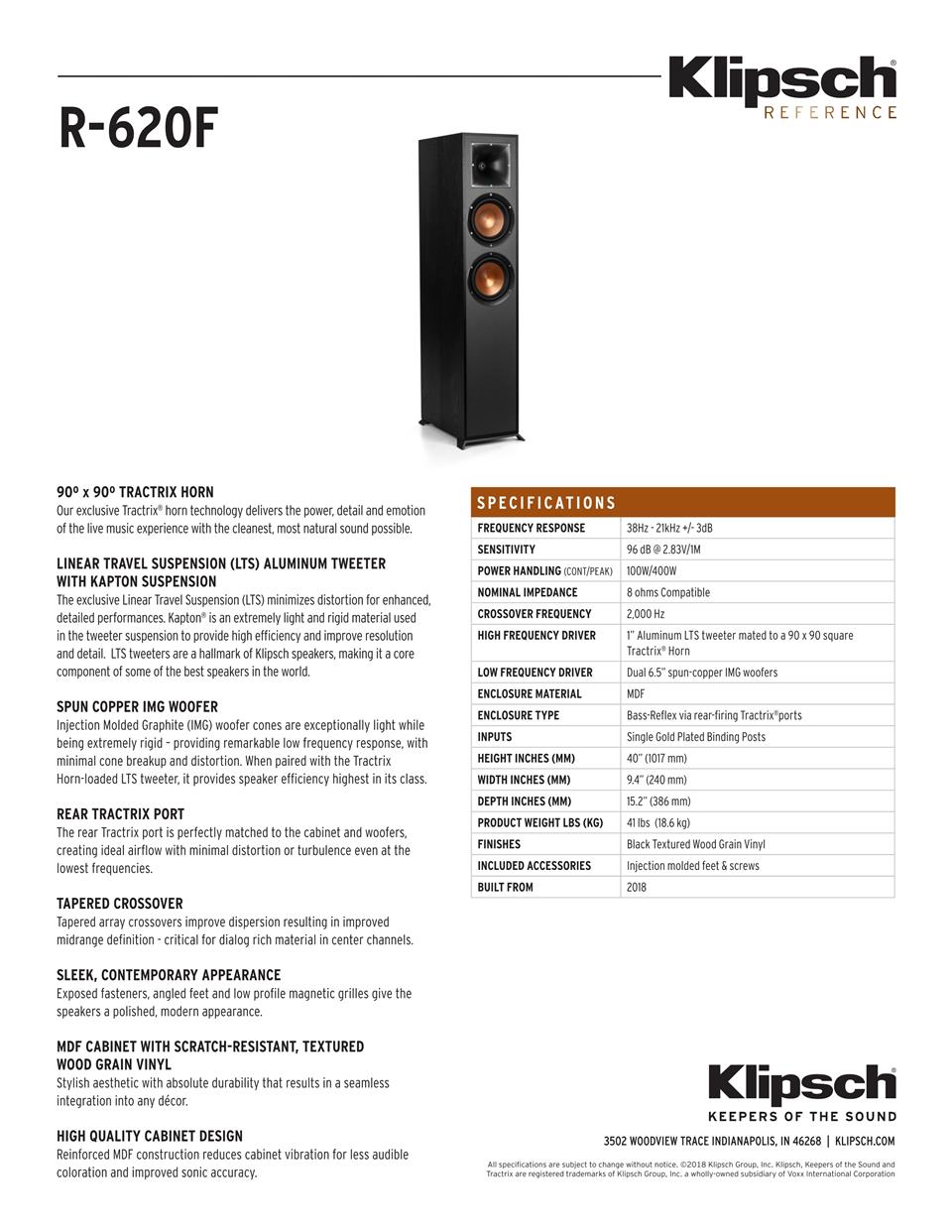 Klipsch獨有的90x90oTractrix®號角技術(shù)可確保R-620F高頻能量對準聽眾,并減少由墻面彈起的間接聲音引起的人工混響或濾波。 使用這項專有的技術(shù)可以使您的電影和音樂獲得最佳的清晰度,動態(tài)性和細節(jié)。