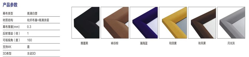 幕布類型:高清白塑 材質結構:化纖布基+高清涂層 幕布厚度:0.3mm 反射增益:1倍 可視視角:160度 支持4k:是 3D類型:主動3D