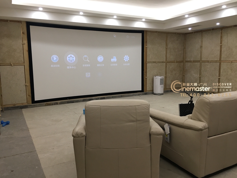 完工后影音房投影面,投影幕按比例定制到最大高度