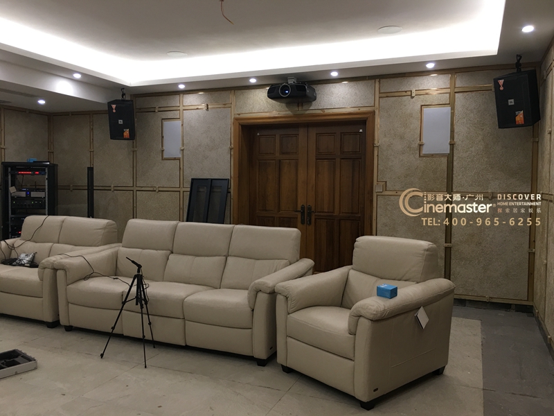 影音房后墻,正在使用專業設備測量調試中