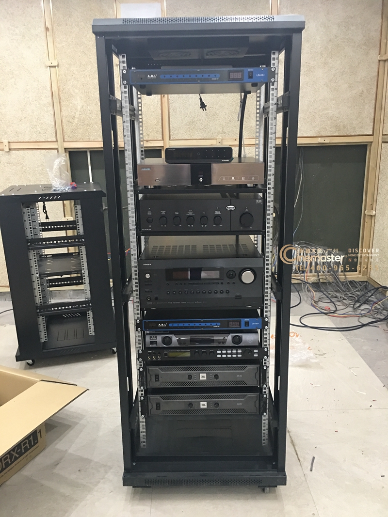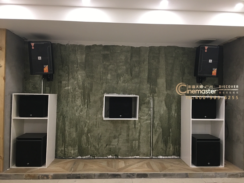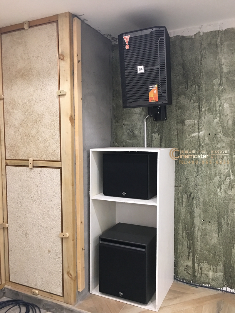 前墻音箱全部隱藏在投影幕后方:卡拉OK音箱2只,主音箱及中置音箱3只,低音炮2只