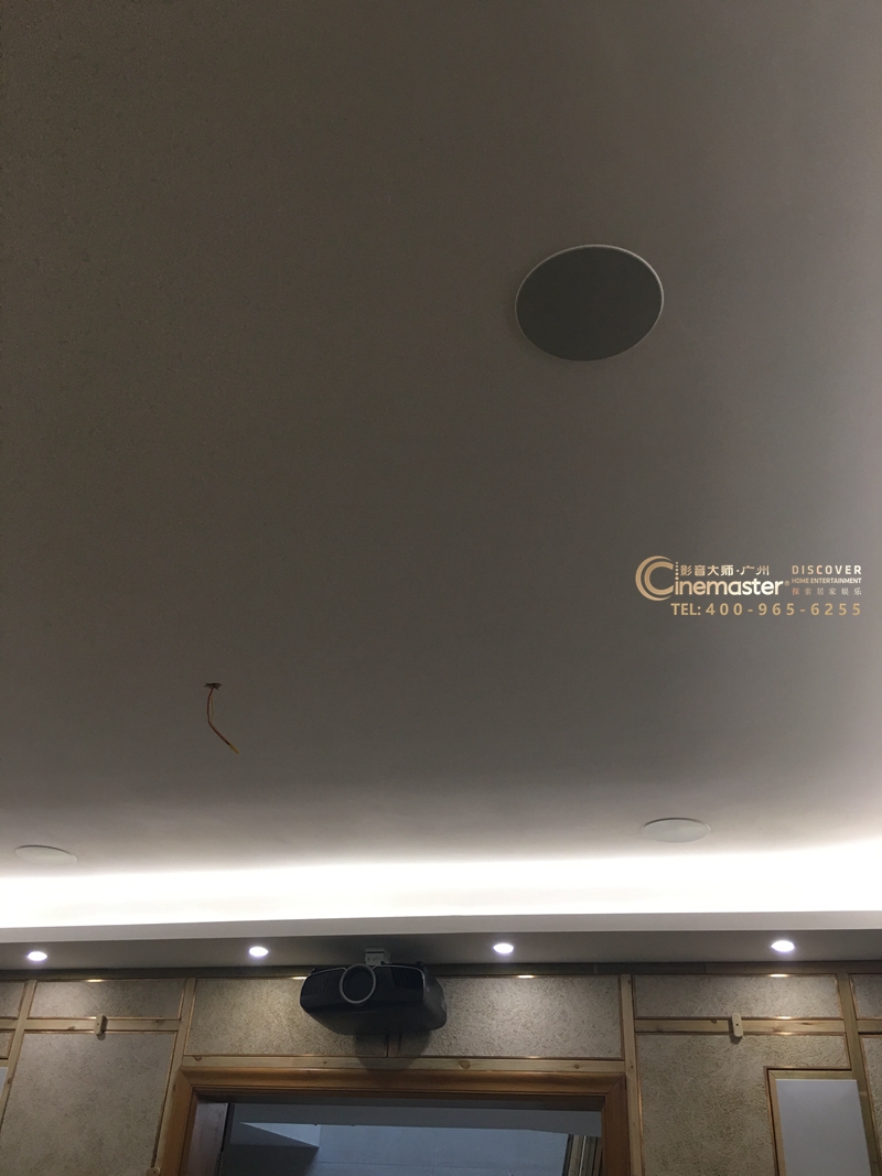 安裝完成的頂部和墻面環繞:左右兩側及后墻環繞均采用杰士PRO-7800-S-THX 嵌墻式音箱,頂部采用杰士CDT-3650-C II吸頂音箱,此兩種音箱厚度僅10cm,在完成墻面裝修,聲學材料鋪設完成的情況下,10cm厚度的箱體可輕松嵌入到墻體,隱藏在天花,與墻體完美融合,把房間空間最大化;此音箱也是近幾年用戶比較偏愛的類型,行業術語大家喜歡叫定制安裝音箱,也就是與裝修相結合,在保證音效的前提下,還能更好的融入到家居設計中!