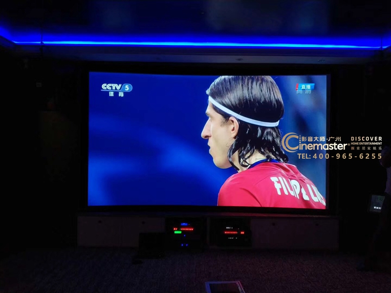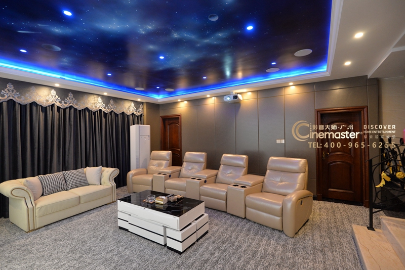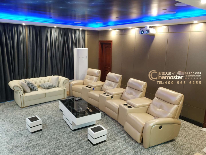 用戶影音房左側為書房,右側是落地窗戶,房間的用途主要是觀影,K歌,聽音樂等。用戶要求書房也要有采光,所以我們的設計師并未把房間獨立隔離出來,而是在影音房與書房間使用雙層厚窗簾;觀影時候則拉上厚窗簾,既可以隔音也可以做吸音材料使用;影音房在負四層,但由于御湖名邸別墅地形特殊,負四層也不是完全在地面以下,所以這次的影音房我們用到了地毯,在聲學方面就容易處理很多,下面分享安裝完工實拍圖。