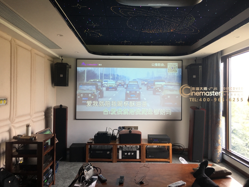 用戶是書房里添加家庭影院,原本就有組合好的5.1聲道音箱,本次升級為最新的7.1.2全景聲系統。投影機也選用了4K投影,天花還定制了星空頂。對于聲學部分,只有左邊墻面做了軟包,右邊是采光窗戶,用了加厚型玻璃,搭配雙層厚窗簾;后墻部分與隔壁房間有共用墻,所以在做隔音的時候用了雙層隔音氈打底,后墻是做成書柜放置書籍,雖然沒有明顯的吸音,但同樣起到了擴散作用。影音房是在頂層,所以全屋鋪設了地毯,吸音量非常足夠, 設備也發揮出了不錯的效果,下面分享實拍圖。