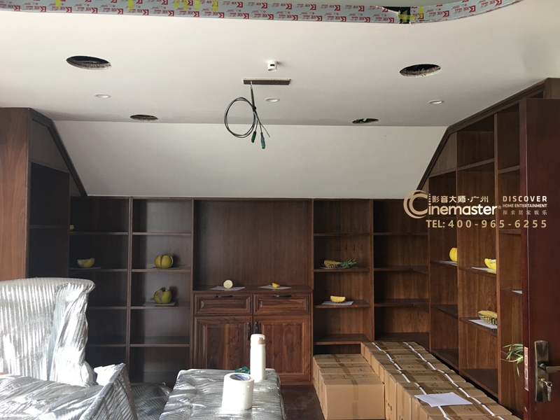后墻書柜,頂部環繞已開好安裝孔位;杰士DS-160CDT用作后環繞音箱,杰士特有的CDT可控向技術,高音及低音炮喇叭單元均可以調節方向,用做后環饒可以根據聆聽位置調整聲音的方向