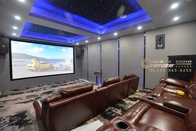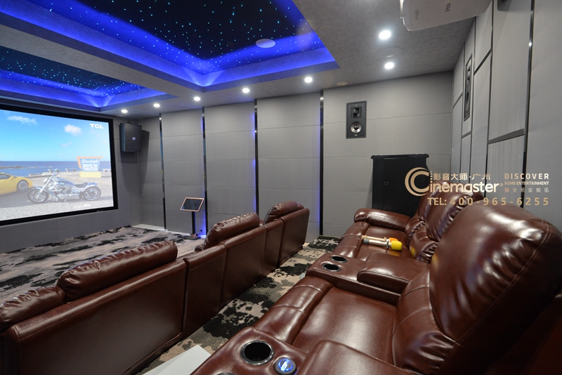 用戶影音房比較長(zhǎng),但寬度有限,高度3.16米,因此沙發(fā)設(shè)計(jì)了兩排,第二排做了抬高設(shè)計(jì)。用戶對(duì)影院要求比較高,影院系統(tǒng)采用了7.2.4杜比全景聲配置,卡拉OK只用了2只12寸的全頻箱。頂部由于有橫梁的原因,設(shè)計(jì)的星空頂則分為兩部分。聲學(xué)部分采用了傳統(tǒng)的聲學(xué)設(shè)計(jì),內(nèi)嵌吸音棉,墻面做蒙布處理。整個(gè)房間的色調(diào)采用的是比較簡(jiǎn)約的灰色系,音箱采用內(nèi)嵌式,完工之后空間非常整潔漂亮,音效也非常震撼。下面分享實(shí)拍圖片。