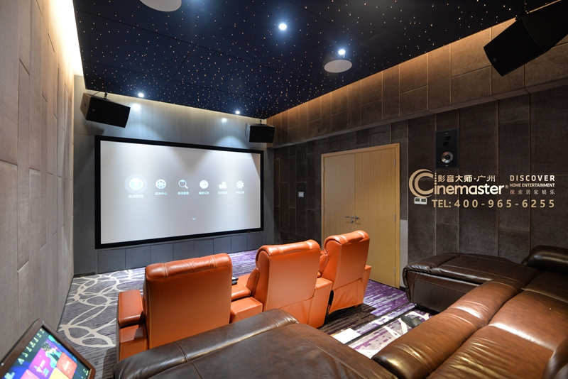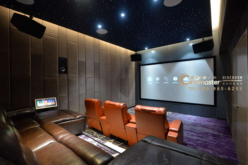 用戶(hù)影音房寬度有限,但長(zhǎng)度很長(zhǎng),高度也比較高3.3米,因此沙發(fā)設(shè)計(jì)了兩排,第二排做了抬高設(shè)計(jì)。用戶(hù)對(duì)影院要求比較高,影院系統(tǒng)采用了7.2.4杜比全景聲配置,投影設(shè)備也采用了最新的4K激光投影,卡拉OK則用了4只全頻箱。頂部使用星空頂造型點(diǎn)綴。聲學(xué)部分采用了傳統(tǒng)的聲學(xué)設(shè)計(jì),內(nèi)嵌吸音棉,墻面貼軟包處理,地面鋪全屋地毯。整個(gè)房間的色調(diào)采用的是比較簡(jiǎn)約的灰色系,音箱采用內(nèi)嵌式,完工之后空間非常整潔漂亮,音效也非常震撼。下面分享實(shí)拍圖片。