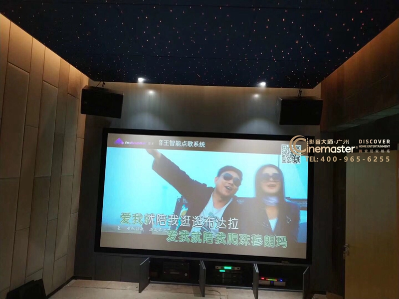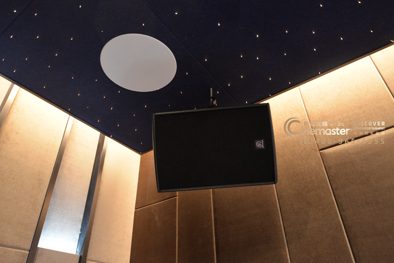 卡拉OK主音箱橫向吊在投影幕上方,輔音箱橫向吊在影音房后方,音箱比較重,需要在原天花先預(yù)埋螺紋桿,點(diǎn)歌屏放置在后排沙發(fā)角落方便點(diǎn)歌