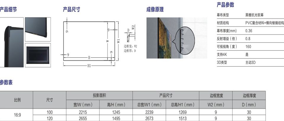 黑珊短焦抗光幕針對超短焦投影應用的正投光學屏幕,屏幕表面為格柵壯結構,上面部分是吸收,下面部分是反射,以此來抵擋來自屏幕上側(cè)的光線,這種幕布只能抵擋屏幕上方的光線,側(cè)面的光還是會對屏幕產(chǎn)生一定影響,是目前性價比較高的屏幕,最大只能做到120寸。