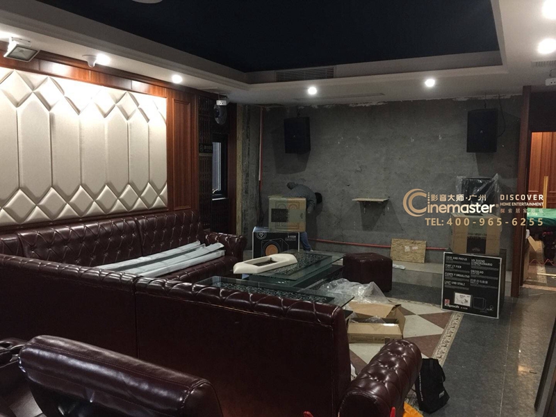 影音房后方全景圖;卡拉OK輔音箱掛在后方角落,橫向吊頂;點歌屏采用壁掛式,4個氛圍激光燈吊頂,機柜放置的影音房后方角落