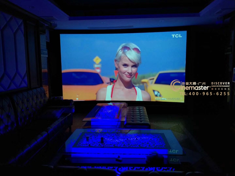 影音房投影面,開燈實拍效果;投影幕采用180寸弧形畫框透聲幕,內嵌入墻體,音箱隱藏在投影幕后方