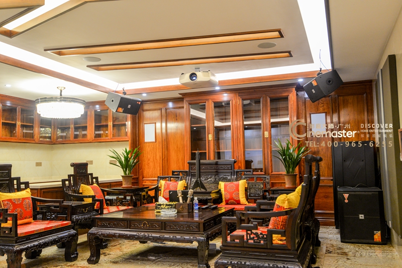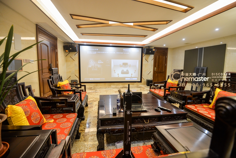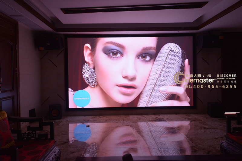 影音房前墻投影面,投影幕使用170寸固定畫框幕,影院音箱隱藏在屏幕后方,卡拉OK音箱吊掛在屏幕兩側(cè)