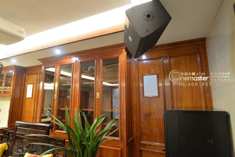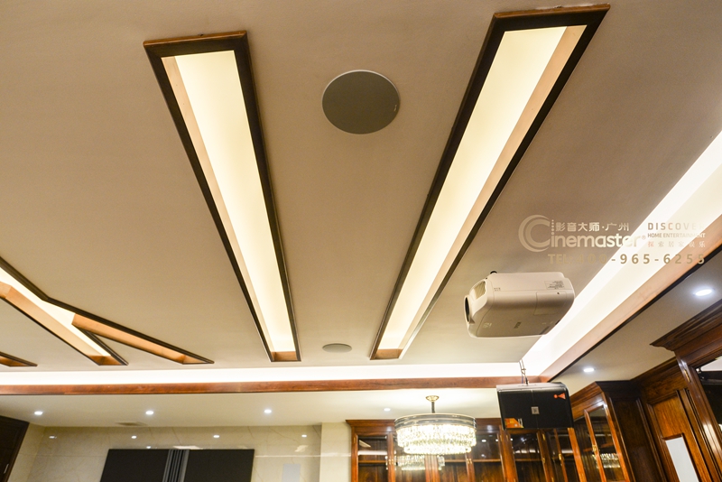 由于后墻處有柜子的原因,無法把后環(huán)繞音箱嵌入到墻內(nèi),因此在柜子上預(yù)留位置把音箱嵌入到柜子里。選用杰士CS-16W作為后環(huán)繞音箱,安裝深度僅98mm,非常的節(jié)省空間。頂環(huán)繞音箱采用CS-16C,安裝深度110mm,音箱外罩為白色,使用后與白色天花融為一體,非常美觀。