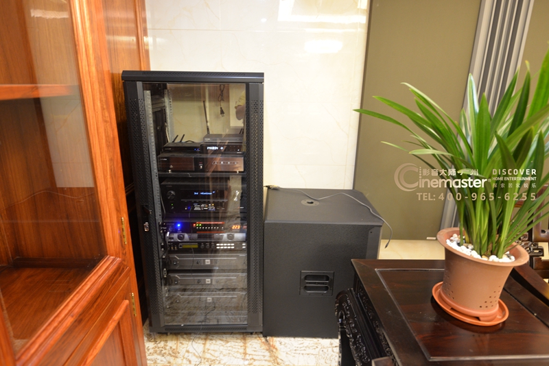 設(shè)備主機放置在影音房后側(cè)設(shè)備柜,18寸低音炮落地放置