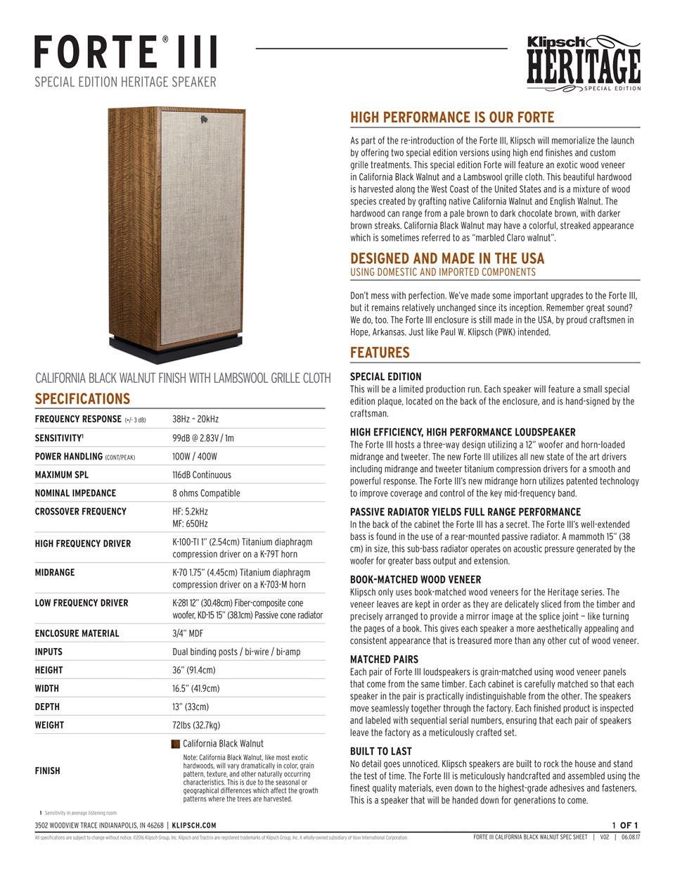 作為Forte III重新推出的一部分,Klipsch將通過提供兩款采用高端飾面和定制格柵處理的特別版車型來紀念此次發(fā)布。只有70對將由這個特別版Forte具有異國情調(diào)的木皮在加州黑胡桃木和一個蘭姆斯沃格柵布。Forte于1985年首次推出,迅速成為最受歡迎的Klipsch車型。雅致的設計和卓越的性能使Forte在競爭對手中脫穎而出。新的Forte III具有更新的化妝品和聲學工程的最新進展,同時保持了原來的魅力,使Forte如此受歡迎。