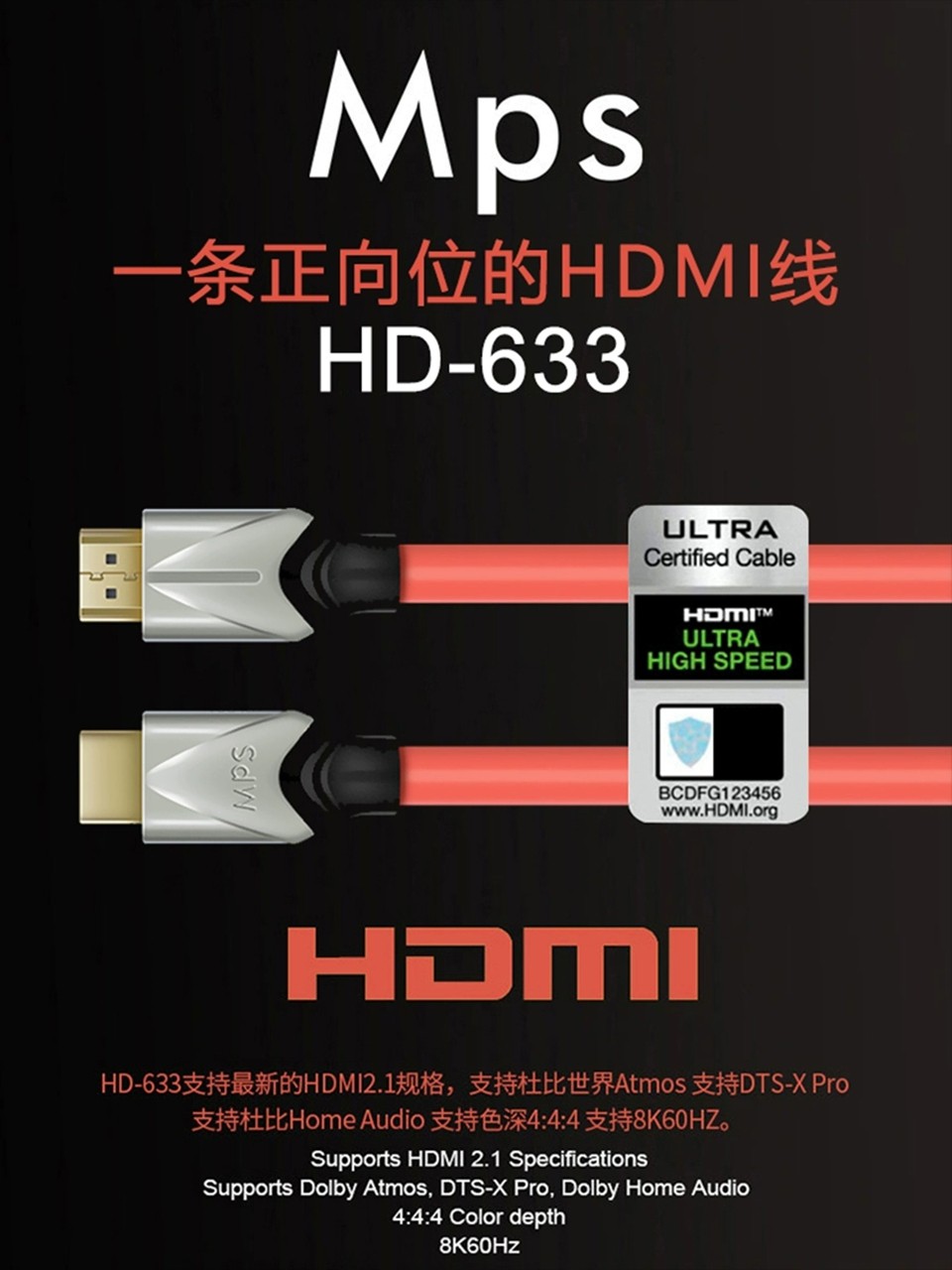 HD-633是臺灣MPS在2021年所推出的新世代HDMI線,這也是業界第一條為了發燒音樂而設計的HDMI線也是首條正向位的HDMI線。
