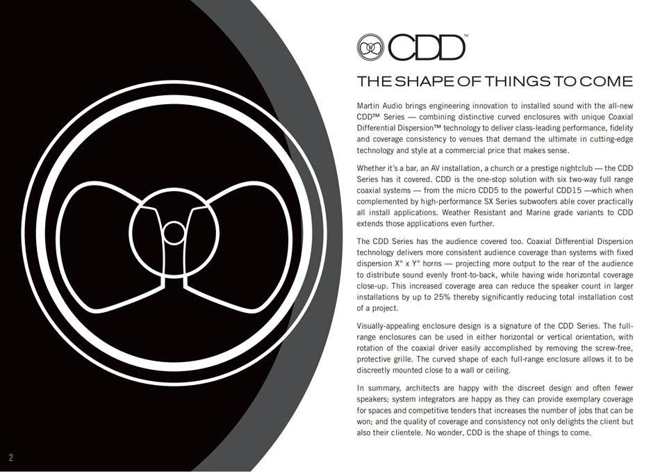 Martin Audio憑借全新的CDD系列產(chǎn)品,為擴(kuò)聲領(lǐng)域固定安裝市場(chǎng)帶來新的技術(shù)創(chuàng)新——該系列產(chǎn)品將具有獨(dú)特弧形的外觀設(shè)計(jì)和市場(chǎng)上獨(dú)一無(wú)二的同軸差異化離散技術(shù)相結(jié)合,為那些追求尖端技術(shù)與品質(zhì)的終極性的場(chǎng)地帶來同級(jí)別領(lǐng)先的性能、解析度和覆蓋統(tǒng)一性。