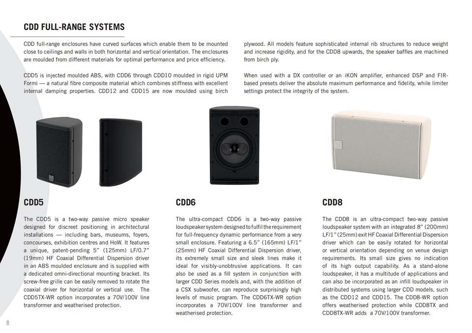 無(wú)論是一個(gè)酒吧、一個(gè)音視頻固定安裝工程、教堂或極富聲望的夜總會(huì),CDD系列都可以滿足它們的需求。CDD被證實(shí)是一種一站式解決方案;六種雙向全頻的 同軸系統(tǒng)——從微型的CDD5一直到強(qiáng)力的CDD15,搭配高性能超低音揚(yáng)聲器——涵蓋了基本上所有的安裝應(yīng)用環(huán)境。