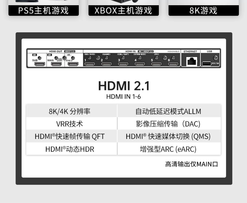 連接:HDMI 2.1(8K分辨率)、USB、模擬、光纖、同軸、藍(lán)牙