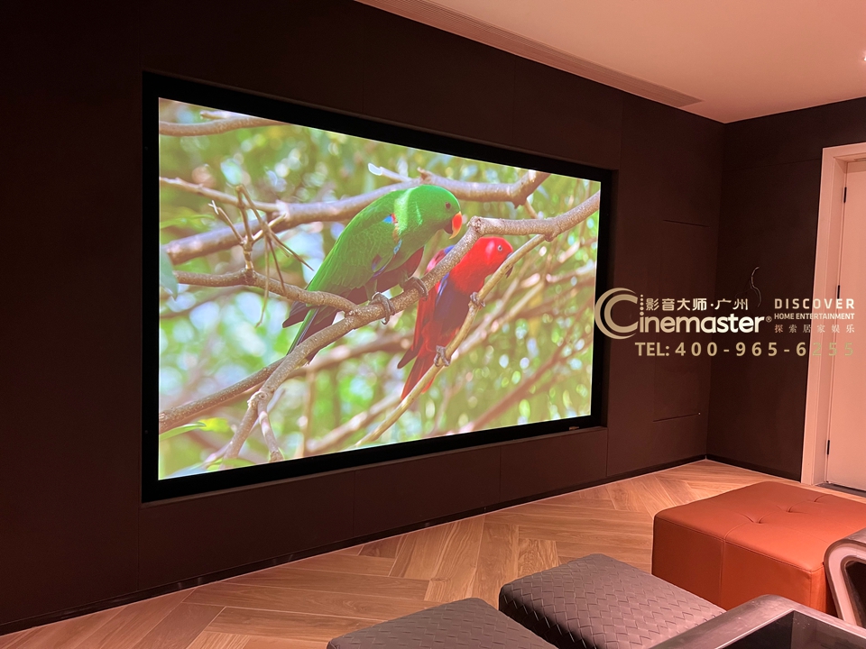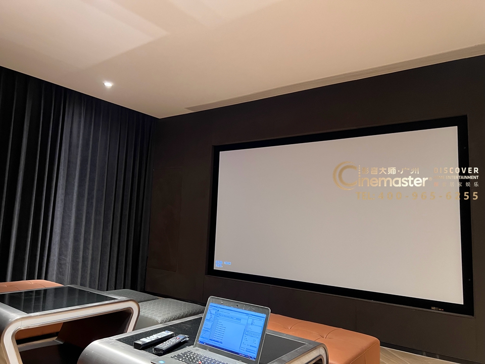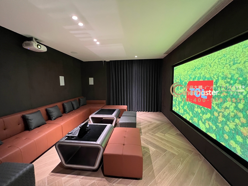 130寸平面畫框幕,影院音箱及卡拉OK音箱均隱藏到屏幕后方;設(shè)備主機(jī)設(shè)計(jì)暗藏柜放置在屏幕右側(cè)